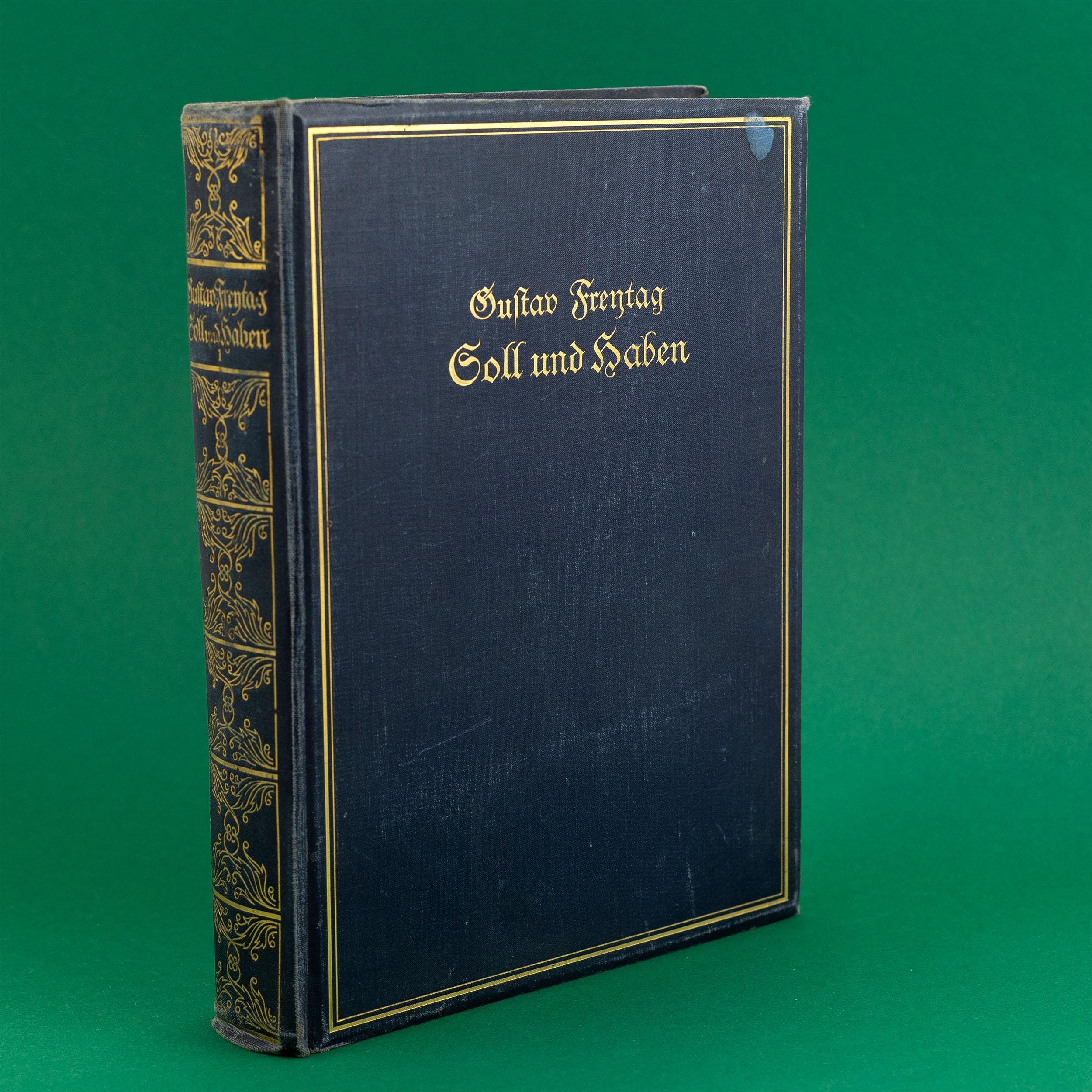 Original German edition of Soll und Haben by Gustav Freytag, published in 1923 by Th. Knaur Nachf. in Berlin and Leipzig. This authentic interwar hardcover features a classic blue cloth binding with gilt lettering and decorative elements, printed in traditional Fraktur typeface. The book includes original illustrations by Otto D. Engel, as well as a portrait of the author. Binding is solid, pages are complete and readable, with natural age related wear consistent with a book over one hundred years old. A genuine vintage literary object, ideal as an antique decorative book, library or study interior accent, photography prop, or collectible for lovers of classic European literature. This is an original 1923 printing, not a modern reprint.