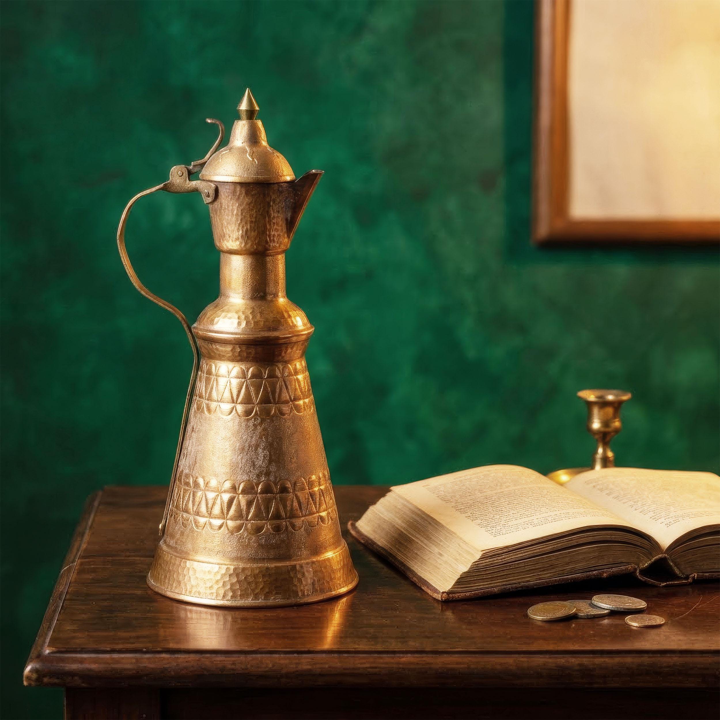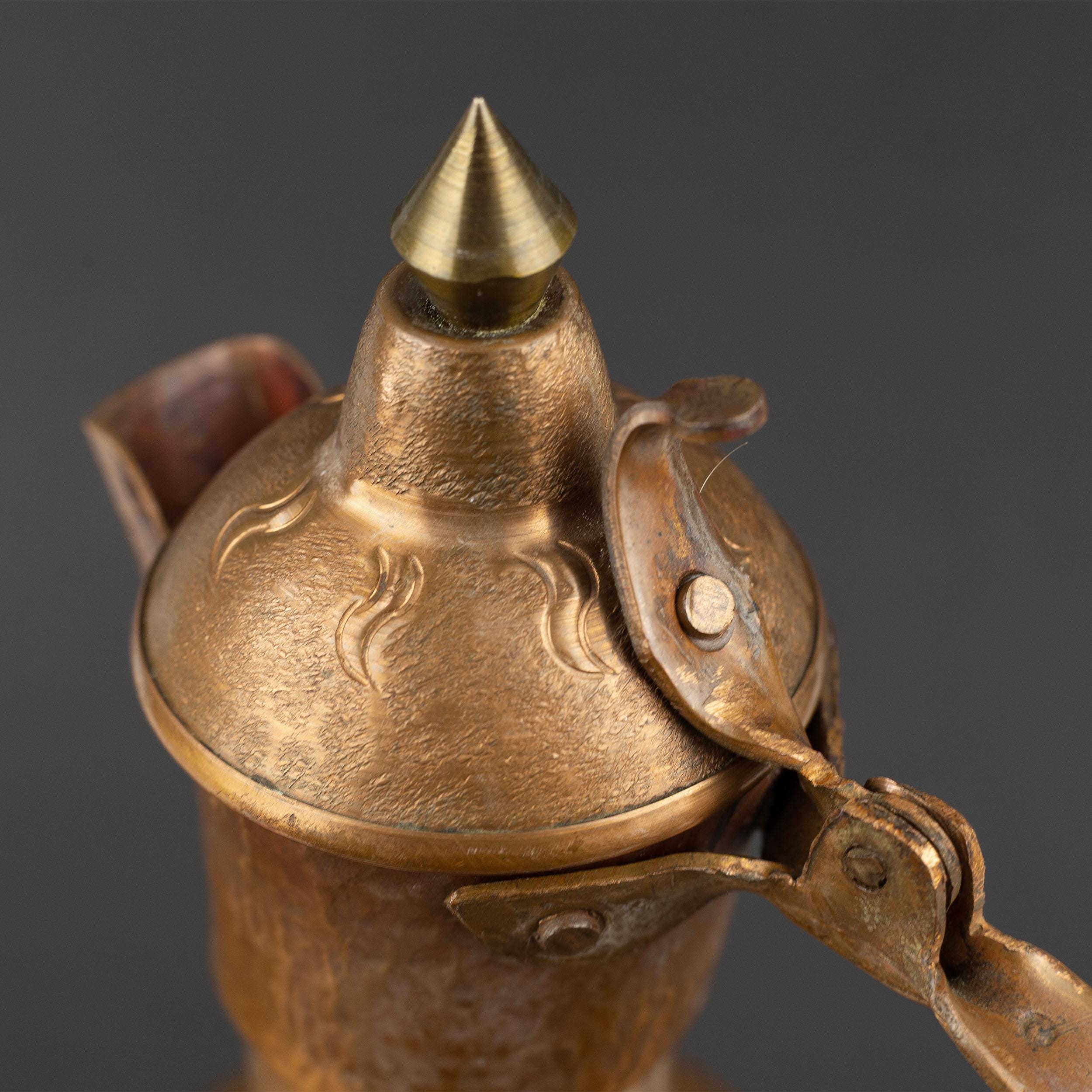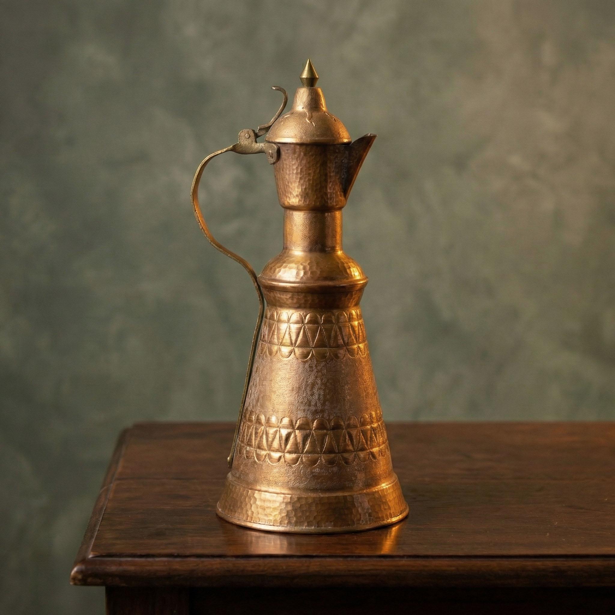 This vintage hand-hammered copper pitcher comes from Albania and dates to the 1960s–1970s, a period when traditional Balkan metalwork was still produced in small workshops rather than factories. The piece features a tall, elegant silhouette, engraved geometric bands, and a naturally aged copper patina developed over decades. The surface shows subtle variations, tool marks, and wear consistent with age, adding authenticity and character. Originally crafted as a utilitarian vessel, today it works beautifully as a decorative vase or statement interior object. This piece is best suited for decorative use only and is not intended for contact with food or liquids. A strong old world presence for rustic, vintage, or eclectic interiors, ideal for collectors of Balkan folk art or lovers of timeless copper decor.